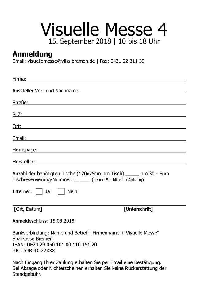 Bei fragen bzw anmelden bitte an visuellemesse@villa-bremen.de melden